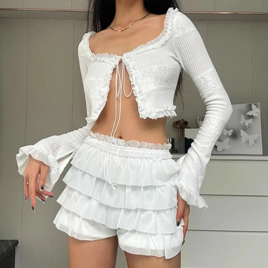 FZCSPEED Women's Sexy Mini Skirt Two-piece Set Strappy Cardigan Top Ruffle Layered Mini Skirt White