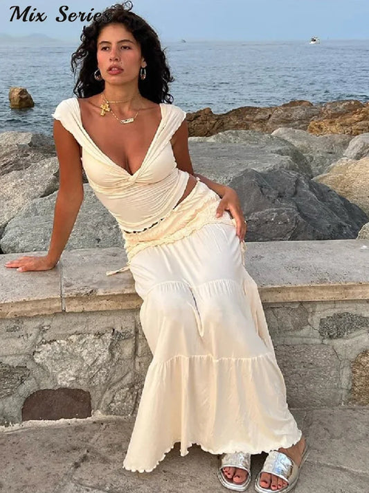 Lady Glams Pleated Ruffles Crop Top and Long Skirt Suit for Women - Sexy Off-Shoulder Sleeveless Backless Skirt Set 2024 Summer Lady Beach Outfit