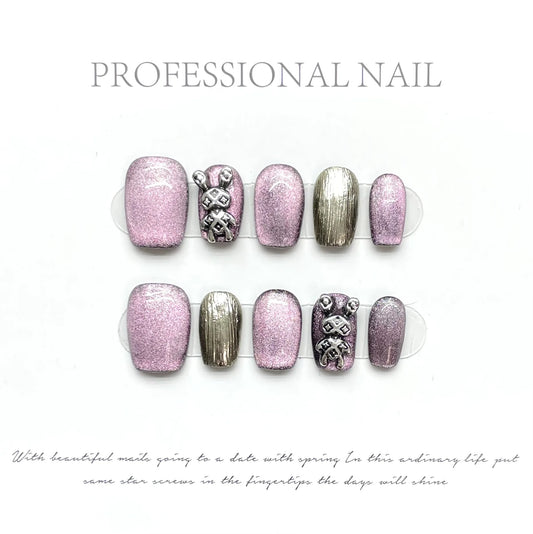 10PCS Wearable Rabbit Cat Purple Crystal Cat Eyes Rhinestones Stick On Nails | Ballet Glitter Handmade Acrylic Fake Nails with Glue | Lady Glams