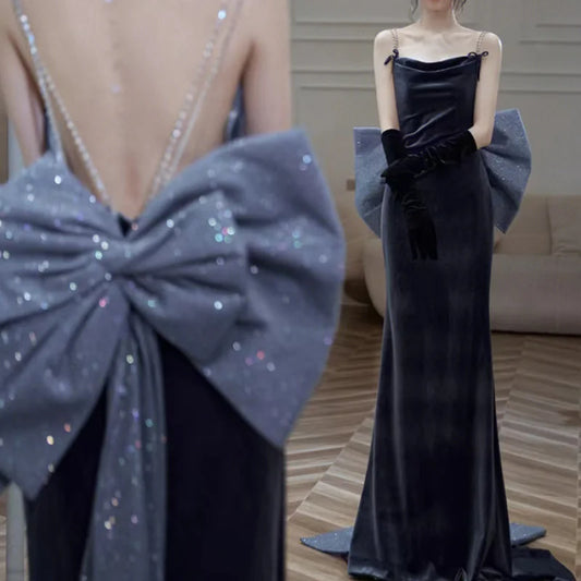 HIKOSAKA Haze Blue Velvet Mermaid Evening Dress - Allure of the Night