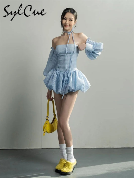 2025 Elegant Shiny Lace Up Women's Backless Ruffles Dress Chic Solid Lantern Sleeve A-line Mini Dresses New Lady Street Vestidos