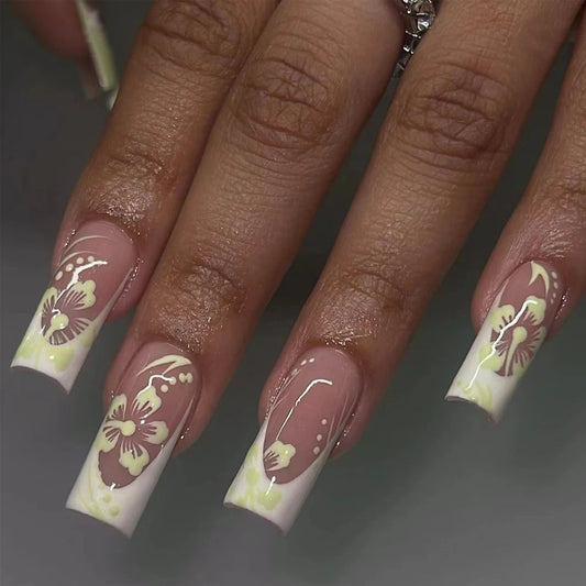 24Pcs Ballerina Long Square Nail Tips False Nails Wearable Fake Nails Butterfly Camellia Flower Pearl Design Press on Nails | Lady Glams