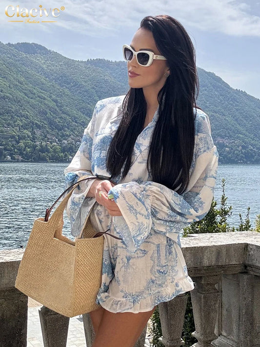 Clacive Fashion Loose Print Shorts Set for Women - 2 Piece Elegant Long Sleeve Blouse with High Waist Ruffle Shorts Streetwear