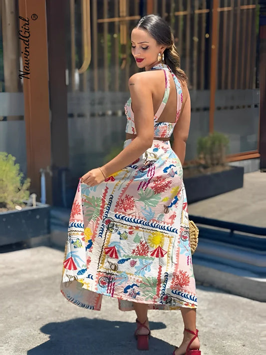 Sexy Print Halter Top Skirt Set - Women Sleeveless Backless Tank Tops & High Waist Split Skirt 2024 Summer Lady Beach Outfit